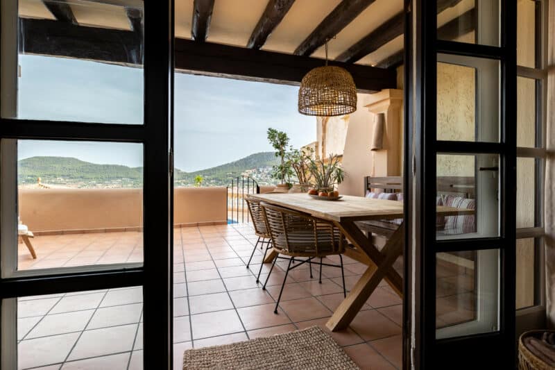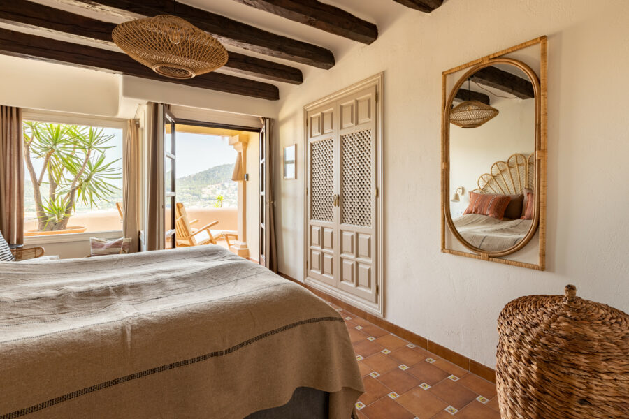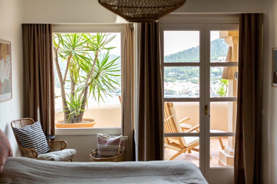 Den anden Mallorca-bolig er en charmerende lejlighed på 119 m2 bestående af tre soveværelser og tre badeværelser, hvoraf to er en suite, samt et køkken i åben forbindelse til stue med udgang til terrassen og en fantastisk udsigt over bugten og den fælles pool, der hører til ejerforeningen. Lejligheden har gennemgået en mindre renovering, og har dermed beholdt sin autentiske stil med karakteristiske terracotta-gulve, pudsede hvide vægge, indbyggede hylder, runde former og rustikke træbjælker i loftet.