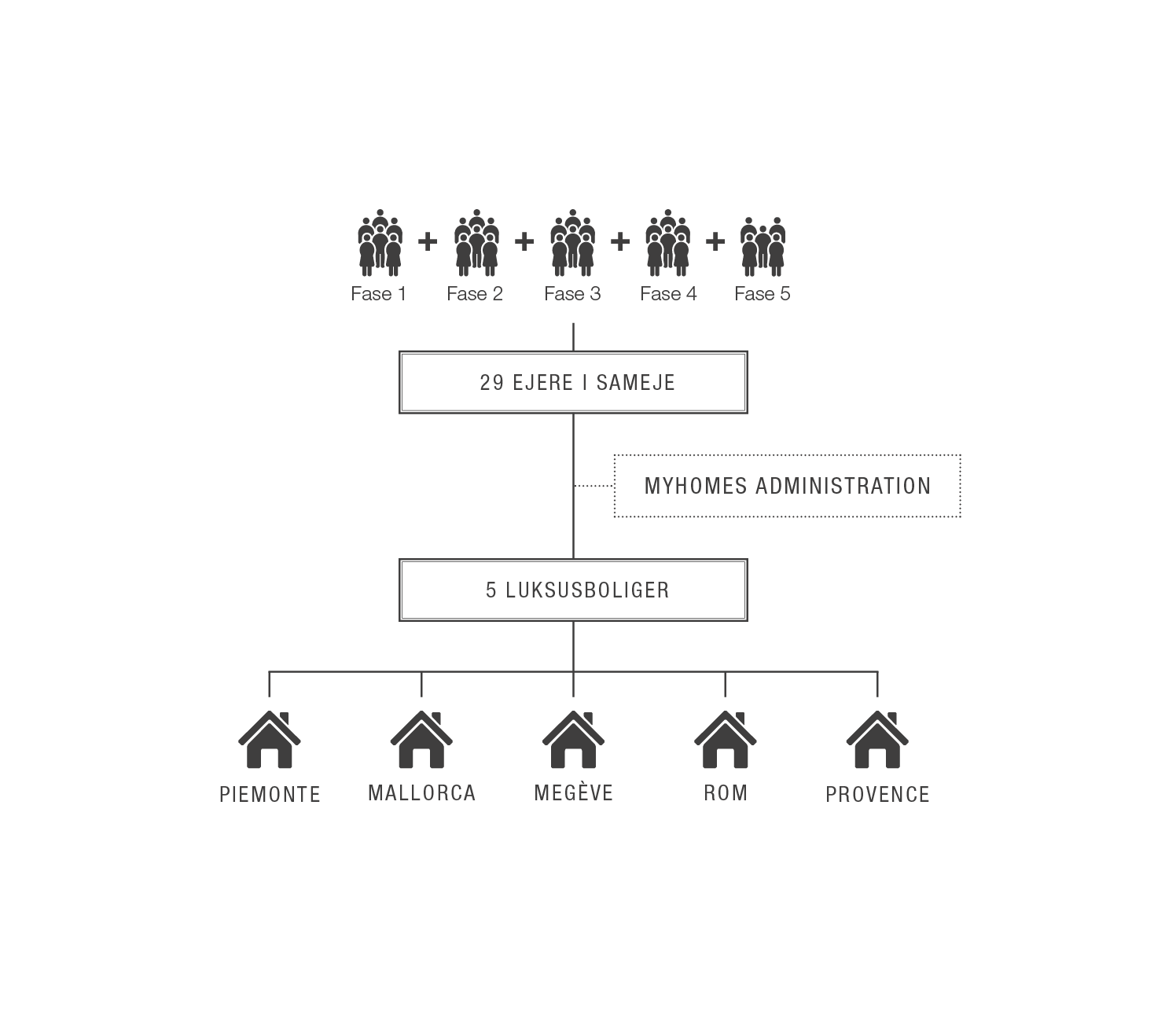 Vi etablerer vores foreninger med i alt 29 ejere, som bliver en del af foreningen i 5 faser. Efter hver fase tilføjes en ny bolig. På den måde får man hurtigere adgang til sine nye europæiske hjem, og kan begynde at nyde det gode liv med MyHomes.