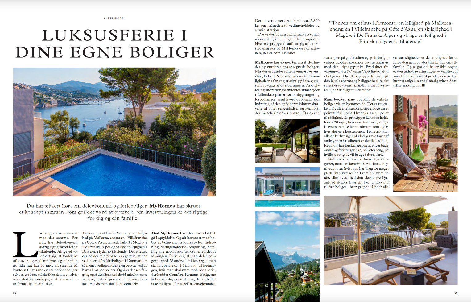 I artiklen beskriver magasinets redaktør, Per Ingdal, hvordan hans bekymringer ved et delekoncept er blevet manet til jorden, i takt med at han har fået øjnene op for de indlysende fordele ved MyHomes konceptet og den luksus, der er forbundet med det. Det luksuriøse ligger ikke kun i at eje fem boliger på attraktive lokationer i Europa, der er også masser af luksus forbundet med at slippe for alt det praktiske som ejer af flere boliger.