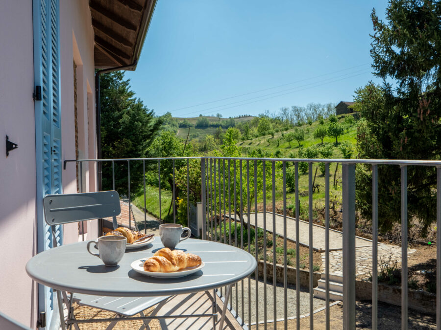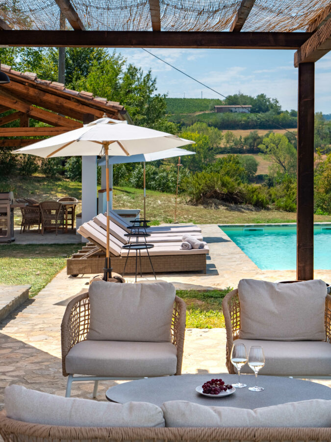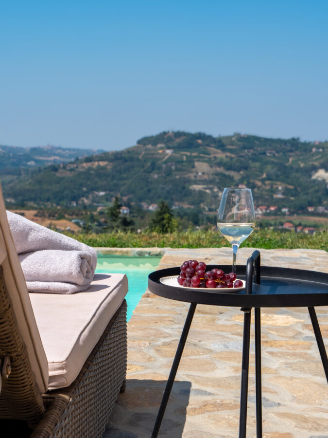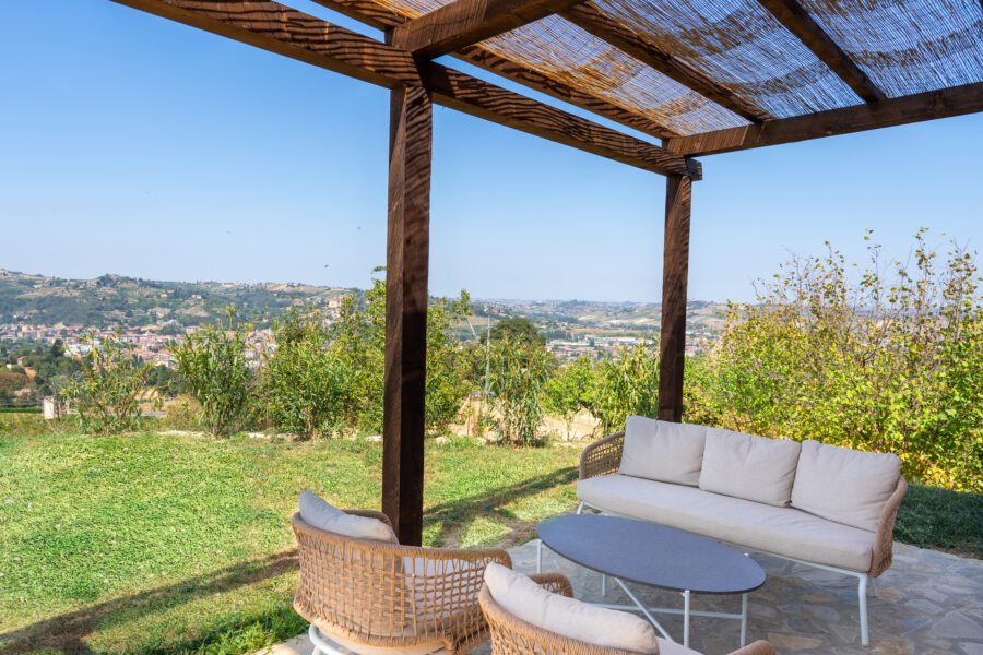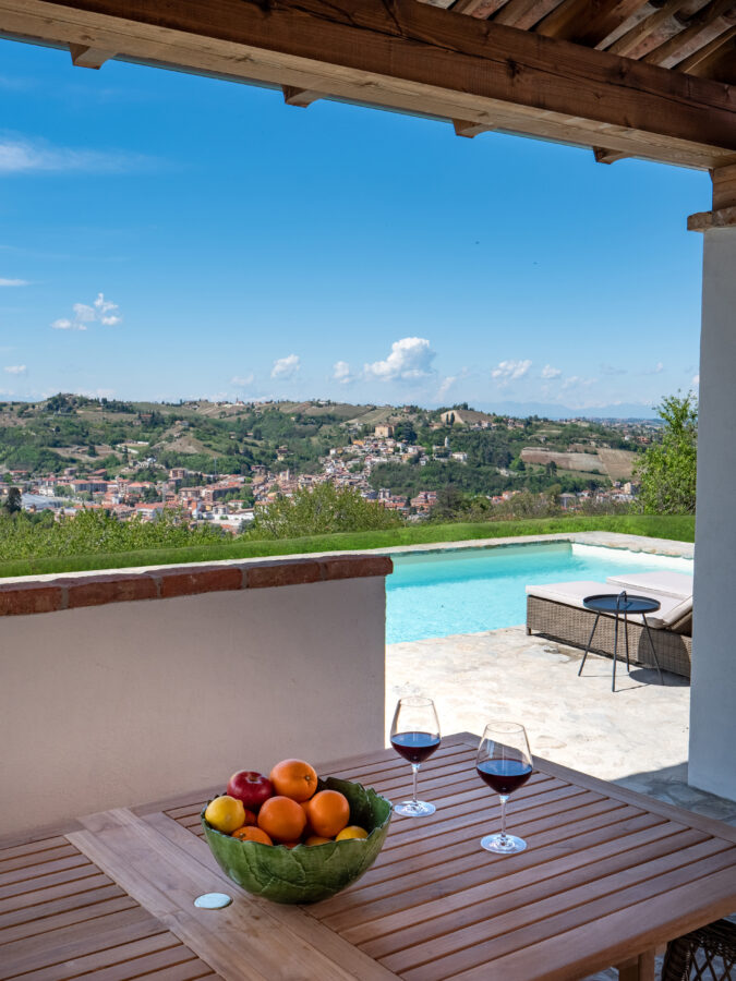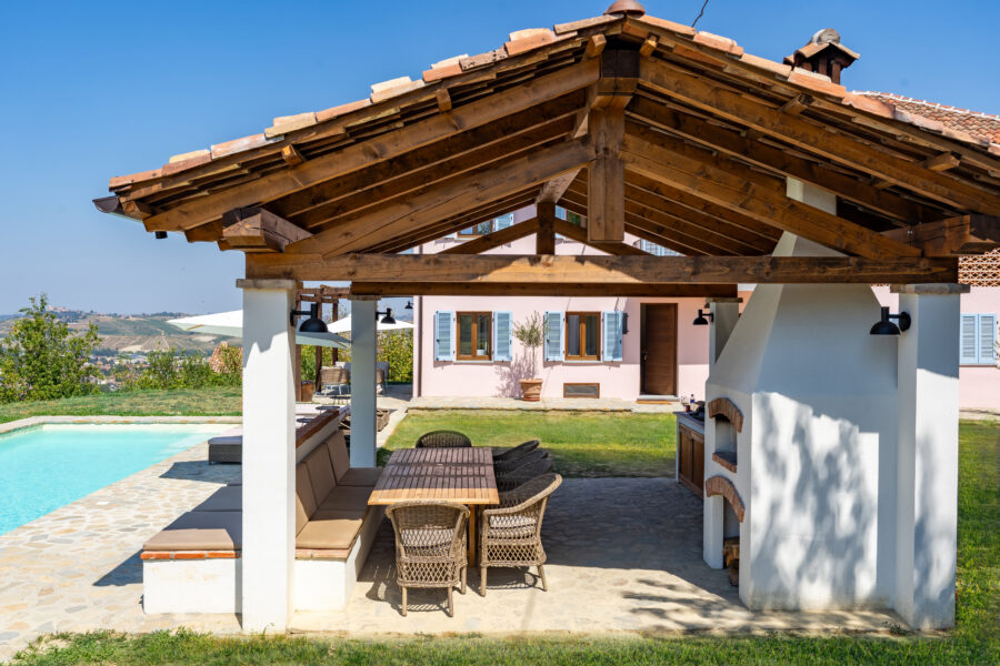Som billedet ovenover illustrerer, er grunden placeret højt i Piemontes bakkede terræn, hvilket giver det smukkeste udsyn til Canelli-by og bjergene i baggrunden. Ejerne ankommer til boligen ad en flot allé med privat port for enden, der åbner op til hjertet af haven. Rundt om huset er et fantastisk udemiljø opført med pool, udebruser, overdækket terrasse, udekøkken og petanquebane. Hertil er der indrettet med loungemøbler, solsenge, pizzaovn og alt service, der hører til et udekøkken.