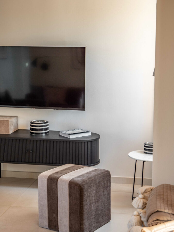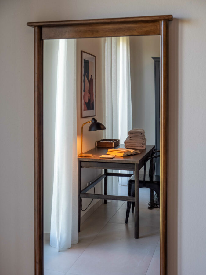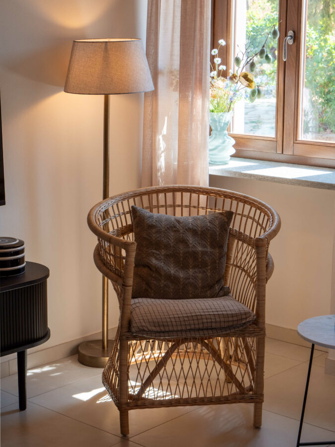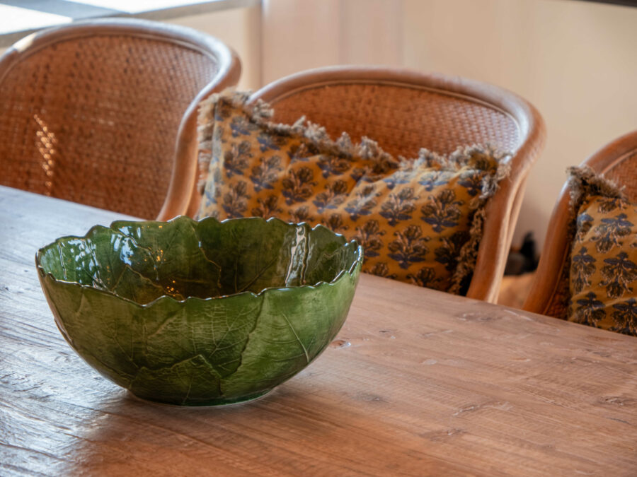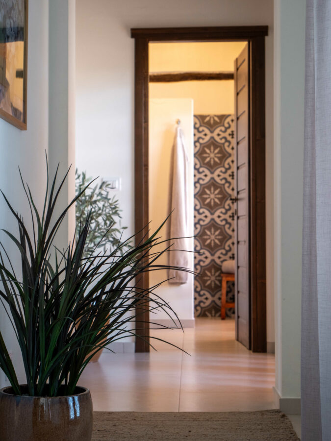 Foruden den omkringliggende kultur trækker indretningen på selve husets stil og autenticitet som de sandblæste lofter i sueetagen og de helt specielle teglåbninger fra det gamle høloft, der udgør nogle af vinduerne på første sal. Derudover inddrages lokalt design i samspil med nordiske løsninger, hvilket kommer til udtryk i de smukke mønstrede fliser, der pryder badeværelserne, og det italienske køkken, der ligeledes er indrettet som spisestue. Det er væsentligt, at boligen både er smuk, behagelig og praktisk. Derfor er indretningen af samlingspunkter som køkkenet og stuen helt central for oplevelsen af hygge.