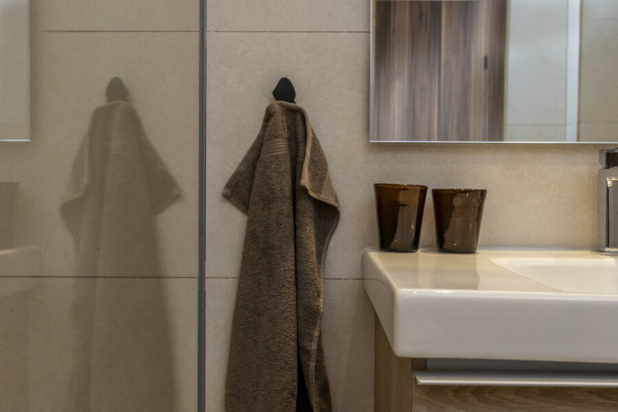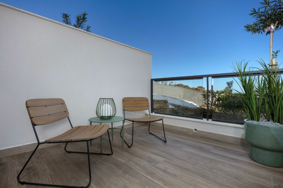 Den nybyggede bolig er en del af et større eksklusivt byggeri, der tilbyder rummelige og energivenlige lejligheder med moderne faciliteter. Selve lejligheden er på 110 m2 og indeholder 3 soveværelser, hvoraf det ene har en suite badeværelse og udgang til egen terrasse. De to andre værelser deler et badeværelse. Køkkenet er i åben forbindelse med stuen med store skyde vinduespartier mod den sydvendte terrasse, der nærmest føles som en del af stuen. Tilsammen udgør terrasserne 55 m2 og tilbyder således god plads til at opholde sig på.
