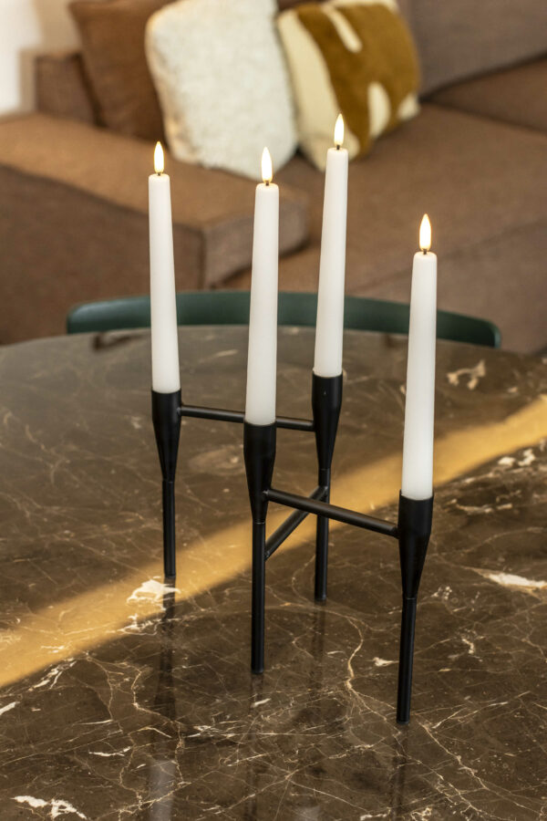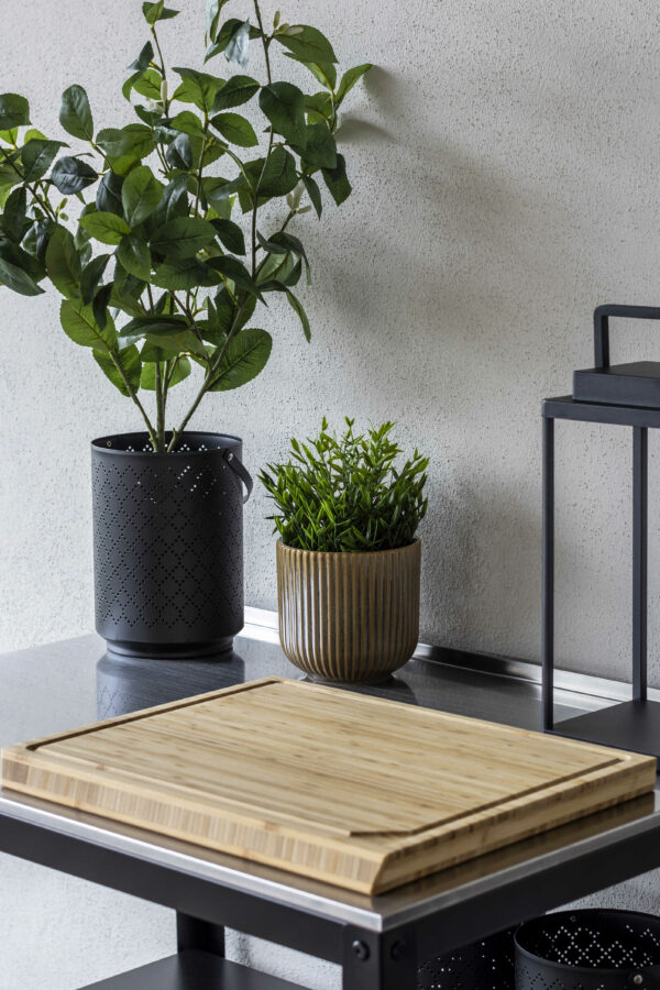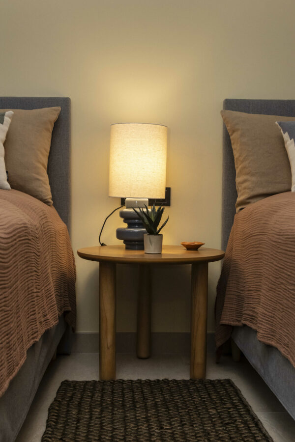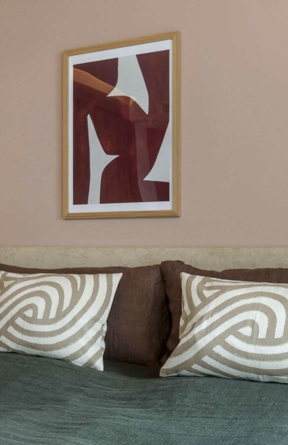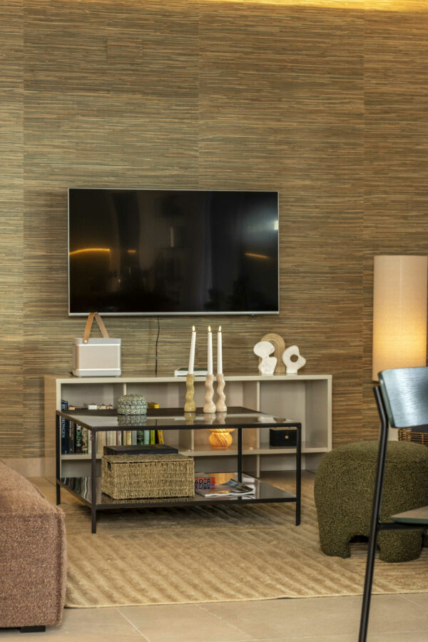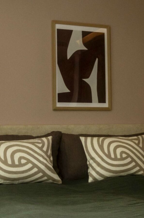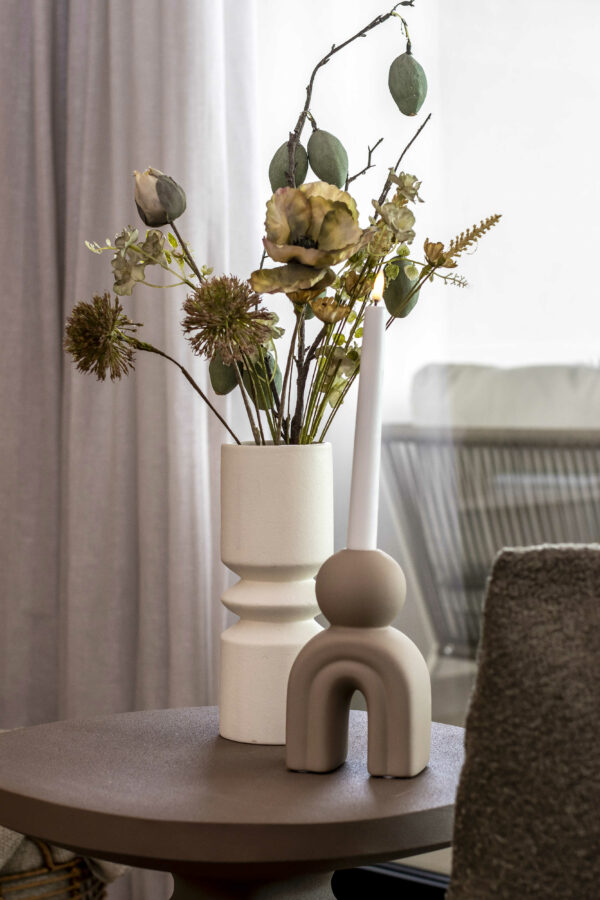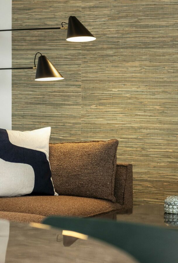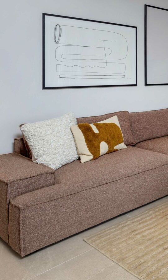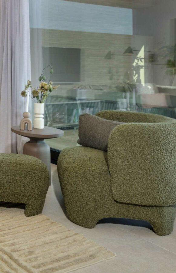 Den luksuriøse bolig er indrettet med rolige, varme farver med et let pift af mere farverige nuancer, der sammen med mønstret interiør komplimenterer de rolige farver. Dertil har vi selvfølgelig udvalgt møbler af lækkert dansk design, hvori blandt der er møbler i bløde og teksturerede materialer som plys og bouclé. Møblerne bringer en varme og ro ind i stuen, hvor de står og harmonerer med den overordnede farvepalette.
