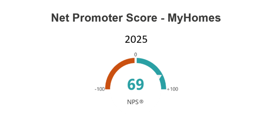 Undersøgelsen viser, at både tillid og tilfredshed er i top. Hele 90 % er tilfredse eller meget tilfredse med MyHomes, og 91 % oplever, at vores koncept lever op til deres forventninger. Mest markant er vores Net Promoter Score – NPS, der ligger på 69 (på en skala der går fra -100 til +100). Den høje score er baseret på en gennemsnitlig vurdering på 9,1 ud af 10, om ejerne vil anbefale MyHomes til andre. Det vidner om en stærk lyst til at anbefale MyHomes til kolleger, venner og familie – og det er vi både glade for og stolte over.