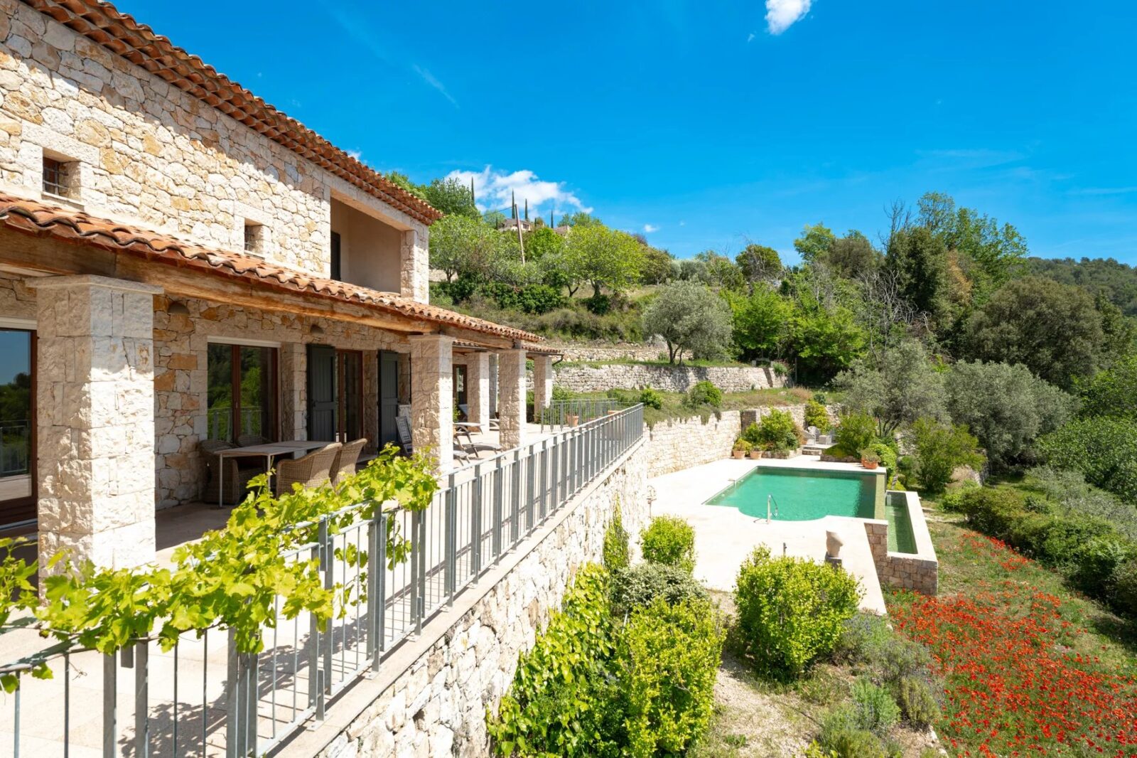 Grunden er på ca. 5000 m2 og ligger helt ugeneret med egen gate og lille adgangsvej, der leder til et stort grusbelagt parkeringsområde suppleret med en lukket garage. Overalt har man den skønneste udsigt over landskabet, og selve grunden er velanlagt med flere små plateauer, støttet af autentiske stenmure. Stedet er grønt og velopvokset og kræver blot lidt omsorg for at komme til at stå helt skarpt.